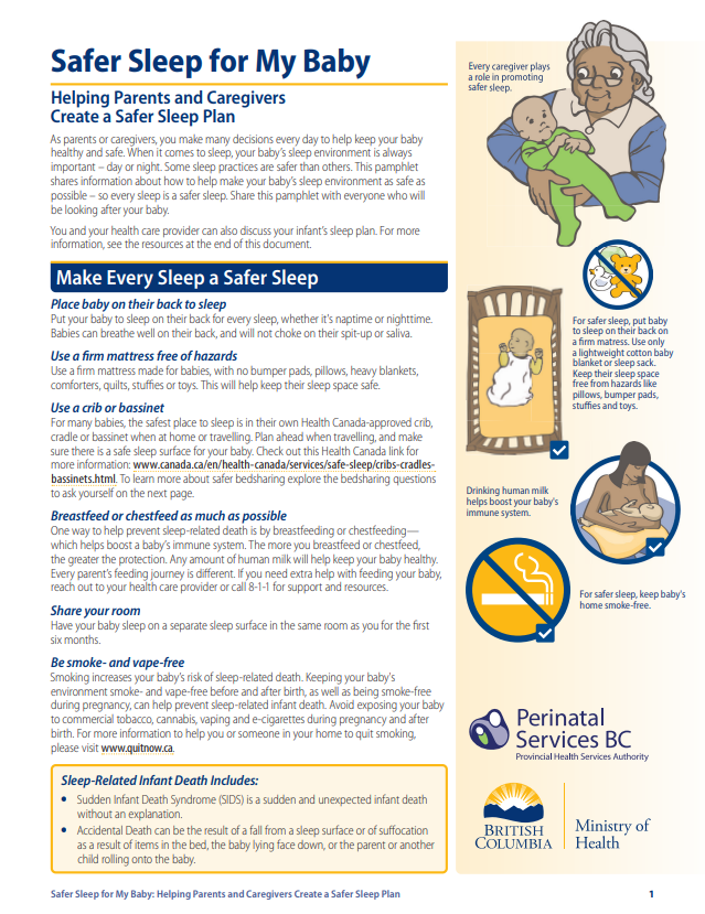 Safer Sleep for My Baby: In the early weeks of life, babies sleep for about 16 hours a day. When it comes to sleep, your baby’s sleep environment is always important – day or night. Some sleep practices are safer than others. Safer Sleep for My Baby pamphlet shares information about how to help make your baby’s sleep environment as safe as possible. – Make every sleep a safer sleep.